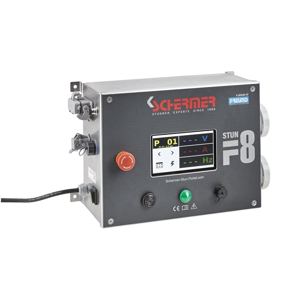 A Freund Stun F8 egy csúcstechnológiás elektromos kábító eszköz, amelyet ipari és közepes méretű vállalatok számára terveztek. Képes mind állandó áramerősségű, mind állandó feszültségű üzemmódban dolgozni, és alkalmas kábítóbokszos vagy lefogós kábításhoz. A készülék megbízható működésével és integrált adatkezelésével támogatja a lehető legjobb húsminőség elérését és megfelel az érvényes jogi és normatív követelményeknek.