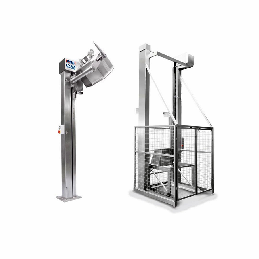 A PSS Svidník LD350/ LD950 emelőeszközök  ipari kivitelű oszlopos emelő- és billentőberendezések, amelyeket húsipari alapanyagok biztonságos és hatékony gépekbe történő adagolására terveztek. A berendezések lehetővé teszik a 120–200 literes kocsik, illetve nagy méretű Big Box ládák gyors felemelését és ürítését darálókba, keverőkbe vagy kutterekbe, jelentősen csökkentve a kézi anyagmozgatást és növelve a termelés hatékonyságát. A robusztus, kétoszlopos kialakítás és a hidraulikus/emelő rendszer stabil, biztonságos működést garantál ipari környezetben.